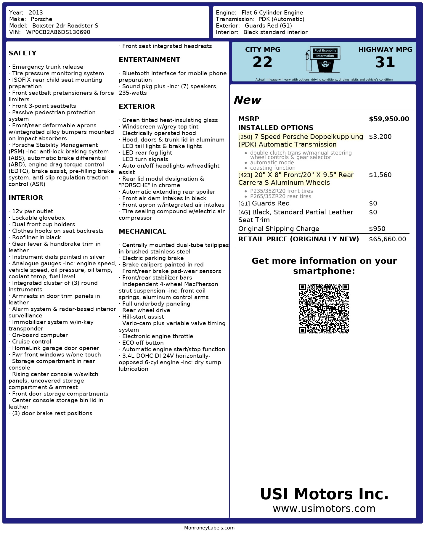 7 Speed Porsche Doppelkupplung (PDK) Automatic Transmission . 20"x8" Front 20"xp.5" Rear Carrera S Aluminum Wheels , Black Standard Partial Leather Seat Trim ................................, for more information the copy of window stiker is included .