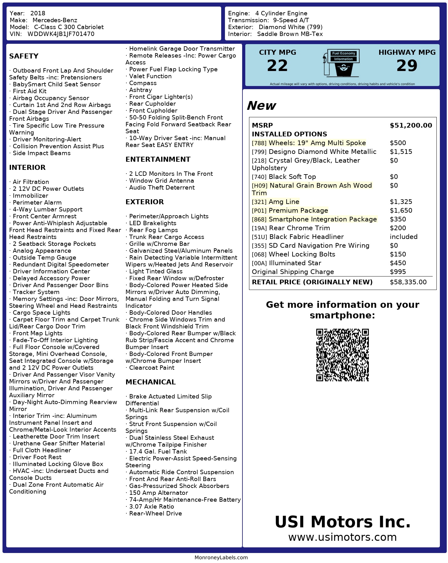 19" AMG Wheels , Crstal Grey/Black Leather Upholstery , Black Soft Top , AMG Line , Pramium Package , Smartphone Integration Package , Rear Chrome Trim , Black Fabric Headliner SD Card Navigation Pre Wiring , Illuminated Star ......................., for more information the copy of window sticker is included .